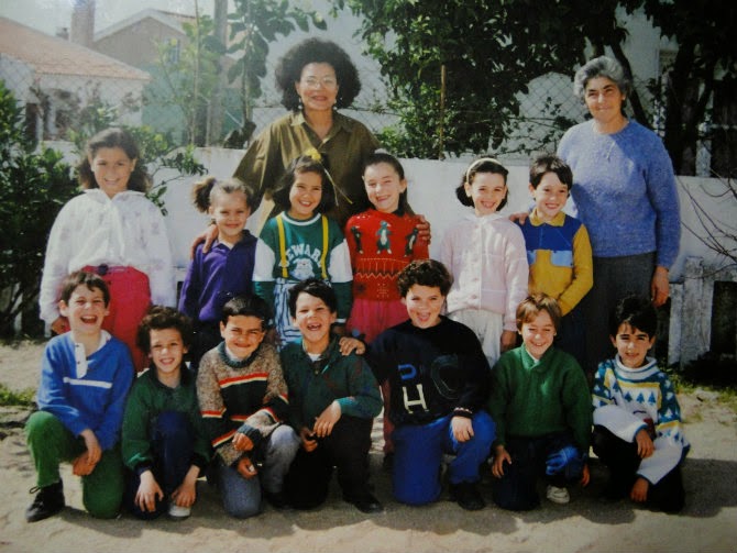 Após todos os preparos seguia alegremente para a escola enquanto pensava mentalmente se seria a mais gira e com mais dentes do 1.º A. Depois o procedimento era sempre igual primeiro as fotos individuais por ordem alfabética (e eu a morrer de ansiedade por ser a letra S, portanto das últimas), e por fim a foto no recreio com a professora, a auxiliar e a laranjeira. Agora olho para os álbuns que a minha mãe foi organizando e só tenho a agradecer por ela ter tricotado tanta roupa, pois era sempre a mais cutxi cutxi e vaidosona.